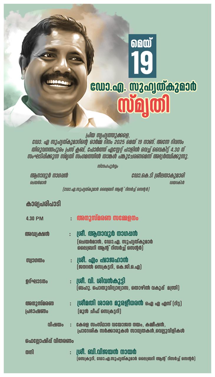 Dr.A.Suhruth Kumar, who unexpectedly left us, was a Legal Professional, Author, Orator, Poet, Professor of LAW, Science Propagandist and a Voluntary Activist, who gave indelible contributions. He had a dedicated life as a Law College Professor, KGOA State Secretary, Editor of KGOA News, Executive Director of Grameena Patana Kendram, Consulting Editor of Chinta Publishers, Leading Activist of Progressive Movement, Associate Editor of Employees Forum Magazine and Honorary Director of Legal Resource Center, KILA, and an active member of Sastra Sahitya Parishad and Balavedi. Suhruth was at the forefront of the agitations for decentralization in Kerala and was voluntary activist to strengthen the local bodies after the 73rd and 74th Constitutional Amendments