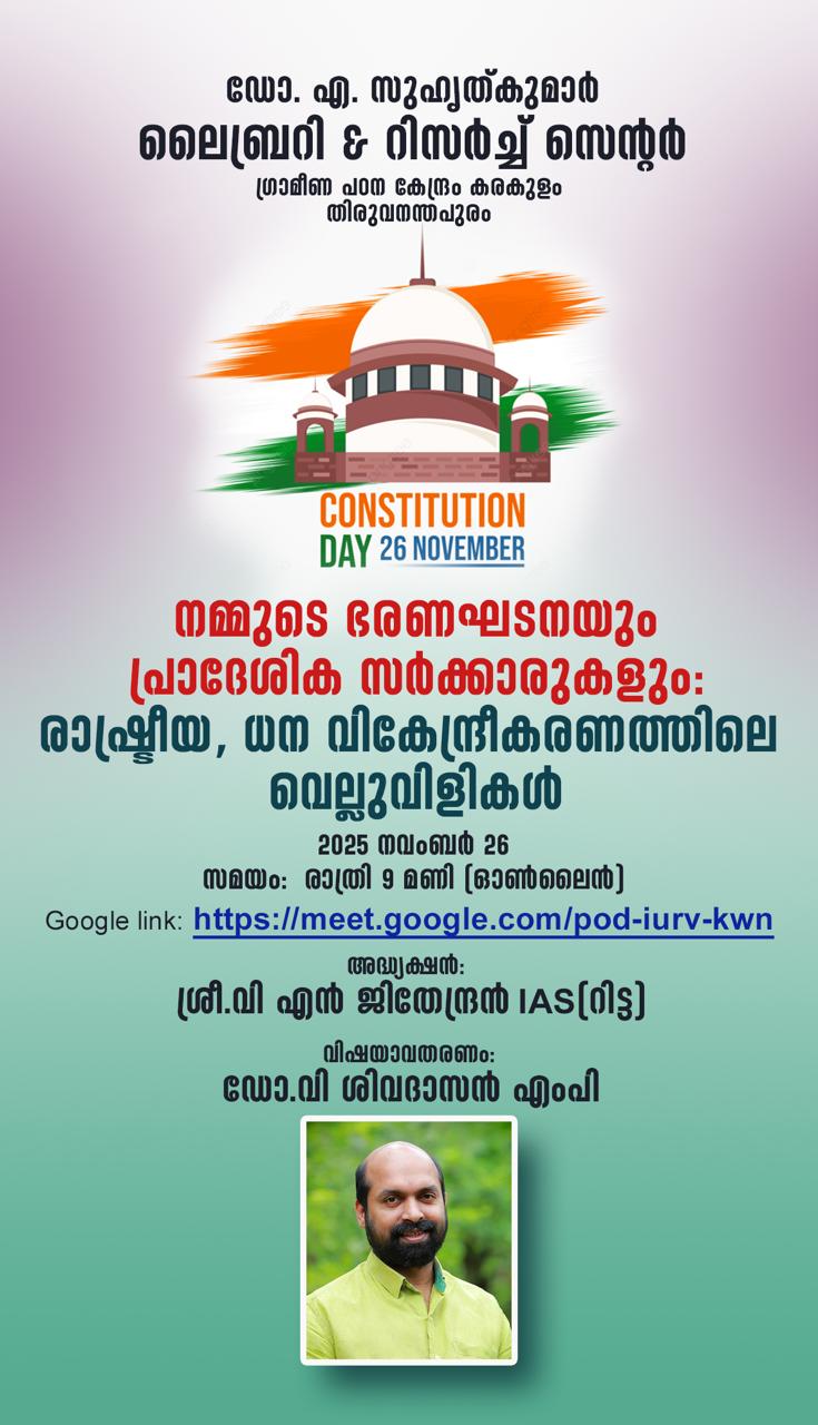 Suhruth used to mention that there were no libraries or research facilities in Kerala at present to study the Decentralization in depth. It was Suhruth’s lifelong desire to establish such a world - class library and resource center. Attempts to expand the library at Grameena Patana Kendram, in this manner were initiated by Suhruth.